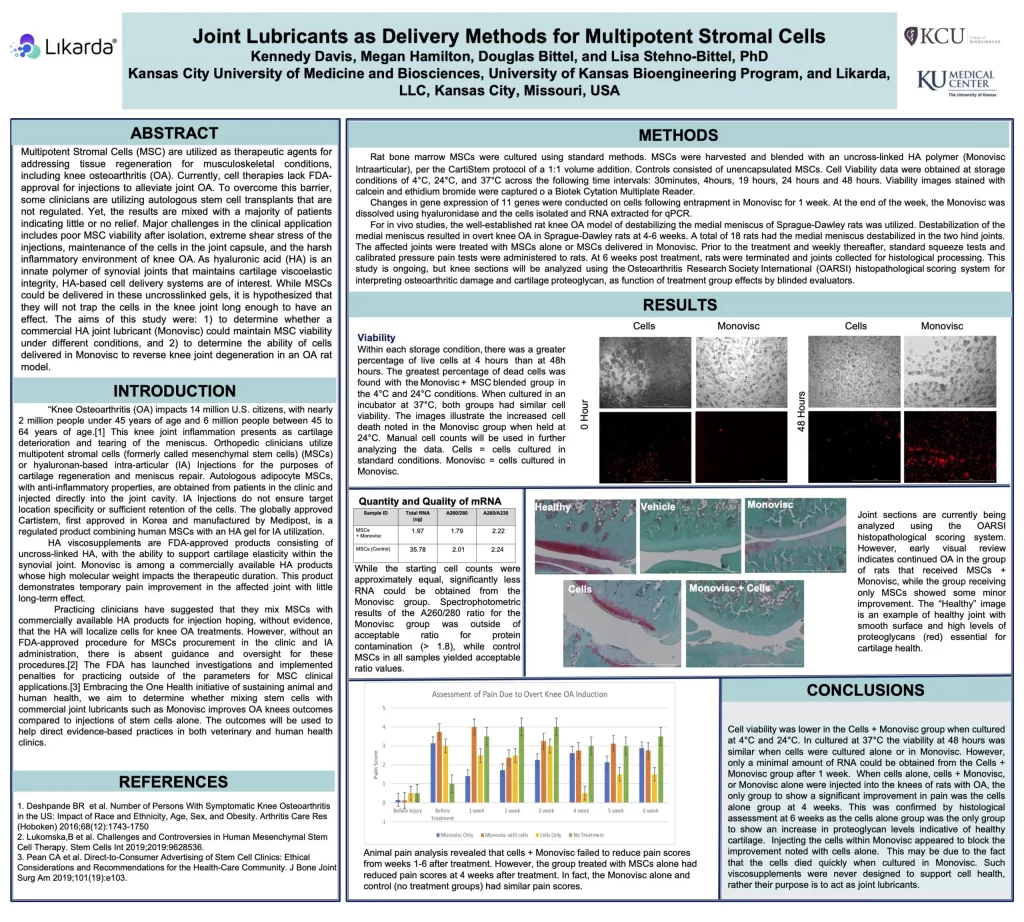 “As I matriculated into Kansas City University‘s College of Biosciences Master’s Degree Program in the fall of 2021, I’ve pursued graduate studies partnering with Likarda in cell therapy research. My research initiatives seek to support the development of an FDA-Approved, GMP Manufactured cell delivery for the treatment of knee osteoarthritis. Within the field of regenerative medicine, there are current challenges associated with clinical outcomes for improving knee osteoarthritis, a major public health condition suffered by countless U.S. citizens. Utilizing novel encapsulation technology and facilitating surgical inductions in rat models to simulate human osteoarthritis, I have gained insights about the steps needed to move a cell therapy through the FDA regulatory process.